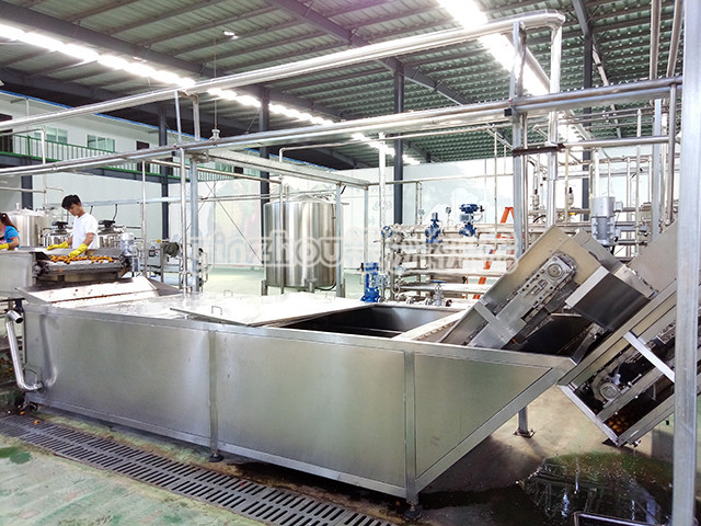 原料收集-清洗-拣果--预热灭酶-双道打浆-草莓视频网站-灌装-成品。包含原料预处理系统、预热灭酶系统、打浆系统,调配系统,均质脱气系统,草莓视频网站灌装系统。